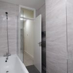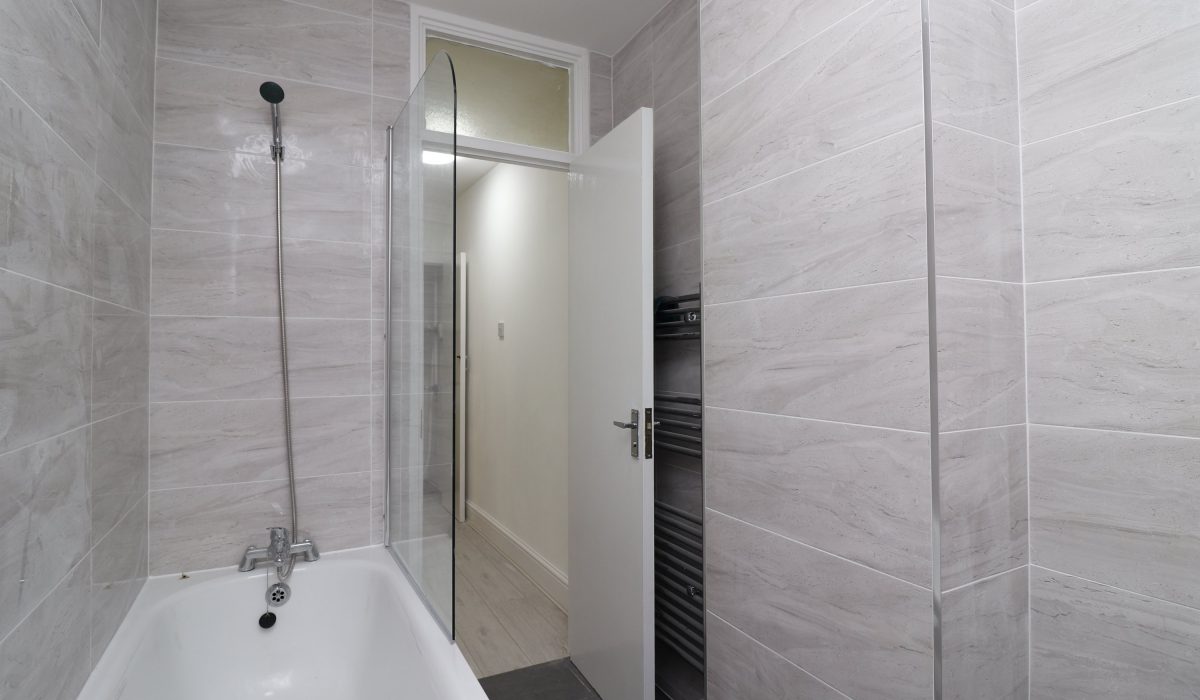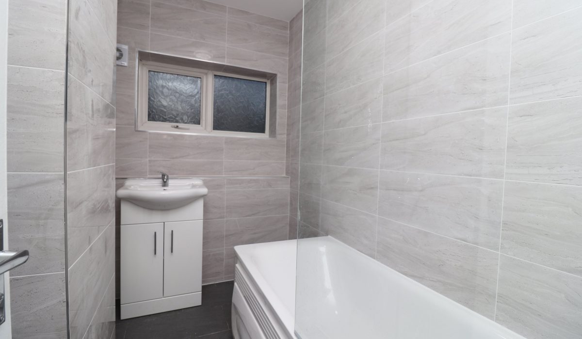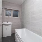 2 piece suite with tiled flooring, washbasin with mixer taps, storage cupboard, towel radiator, bathtub with mixer tap and shower shield. Front aspect double glazed windows.