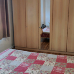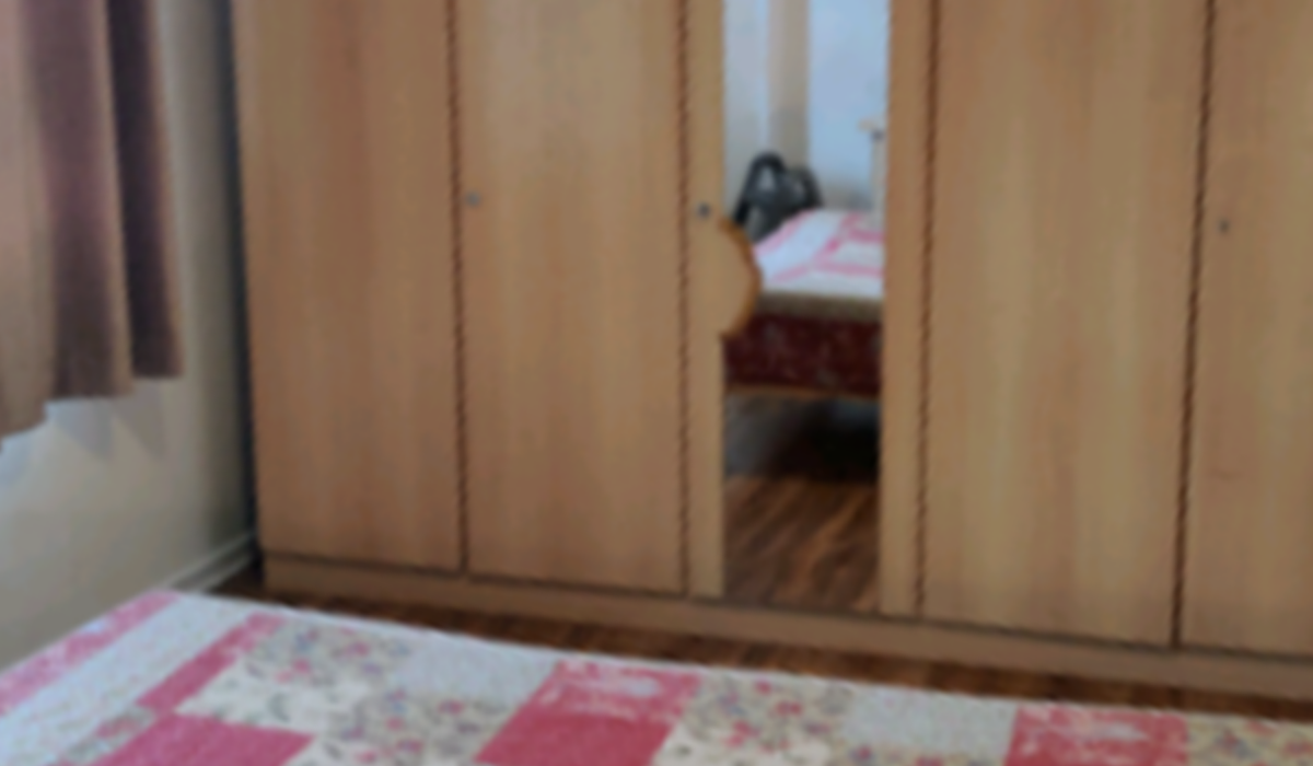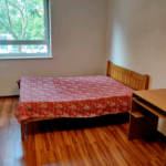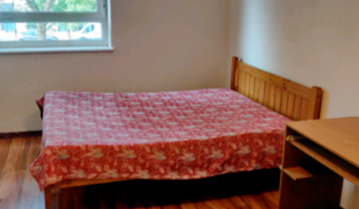 Double bed, wood laminate flooring, desk, and various power sockets.