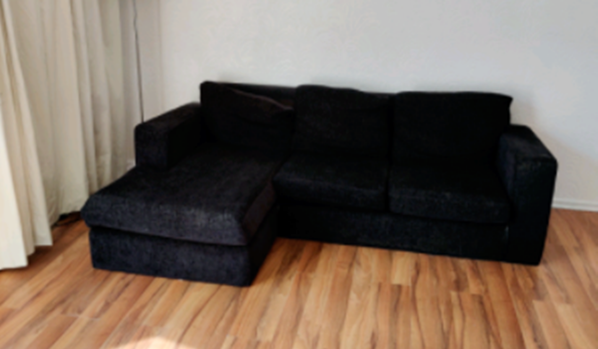spacious. Wood laminate flooring, three-seater sofa, and various power sockets.