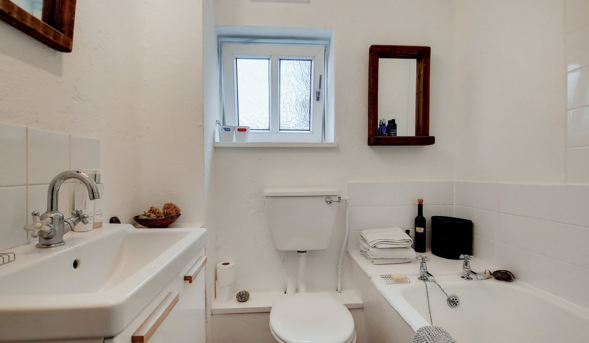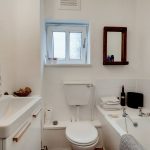 3 piece suite with bathtub with separate taps, wash hand basin with mixer tap, low-level flush WC, part tiled walls, light fittings, fitted storage cupboards.