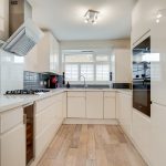 Laminate flooring throughout, front aspect double glazed windows, part tiled walls, stainless steel sink with mixer taps. Integrated; dishwasher, fridge/freezer, microwave, oven, gas hob, and extractor fan. Range of eye and base level units.