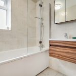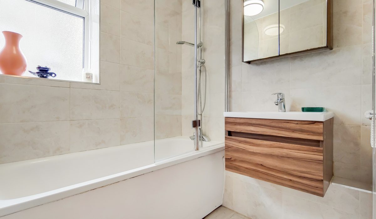 2 piece suite, bathtub with shower attachments, washbasin with mixer tap, mirror storage, towel radiator, tiled flooring, and tiled walls.