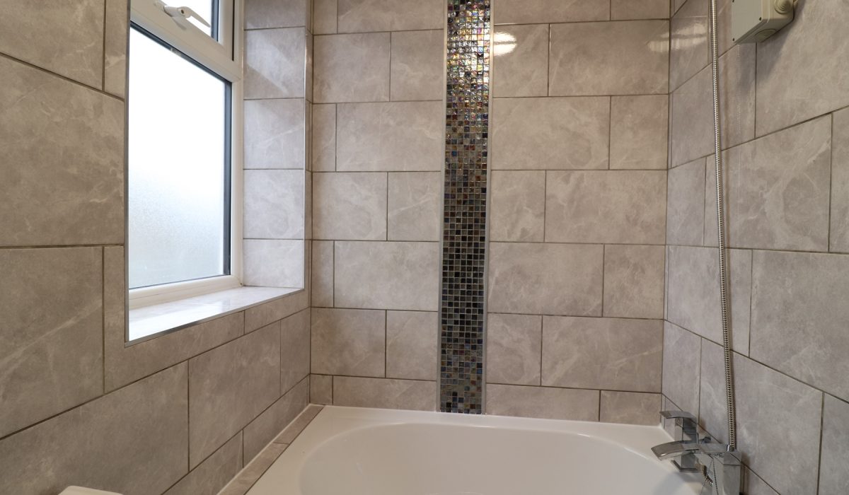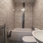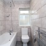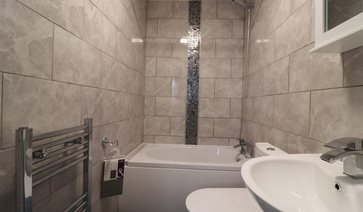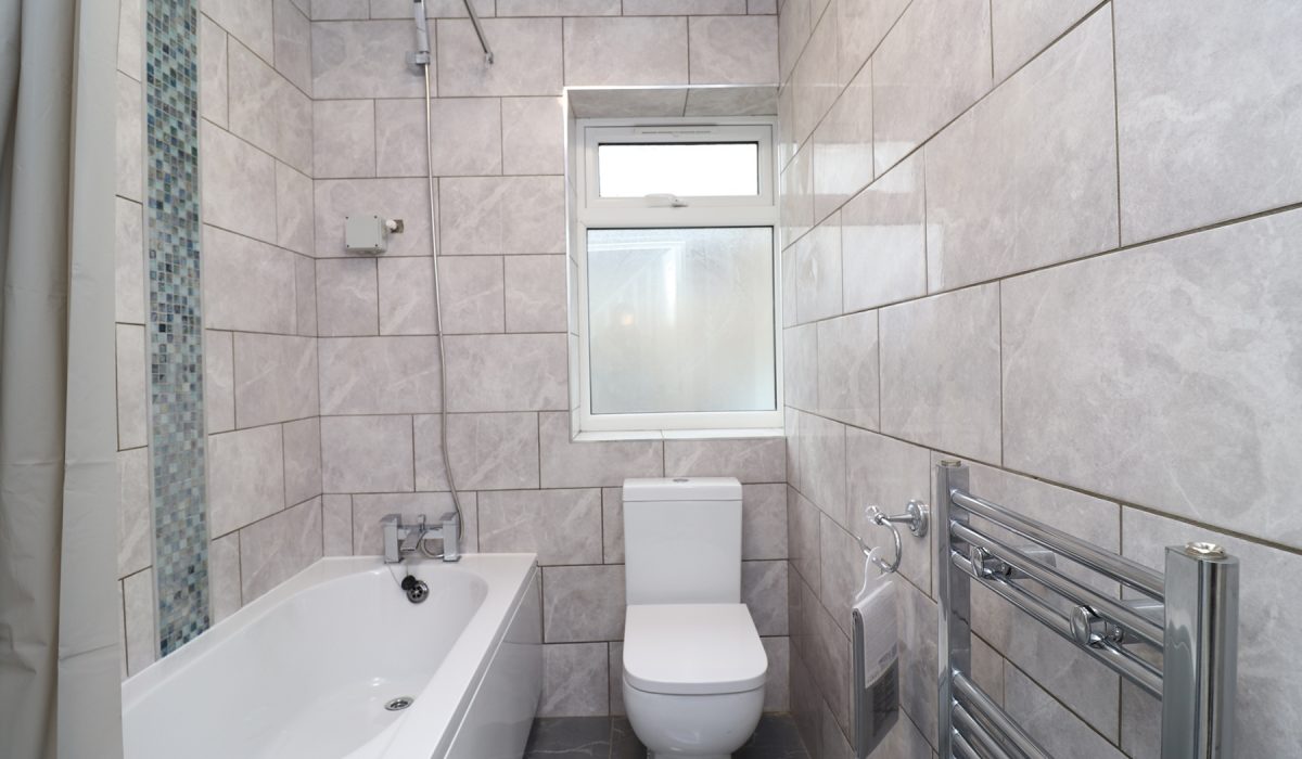 Three-piece suite, Fully tiled floor and walls, chrome towel rack, side aspect double glazed window, low-level flush WC Bath with shower attachment, washbasin.