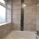Three-piece suite, Fully tiled floor and walls, chrome towel rack, bath with shower attachment.