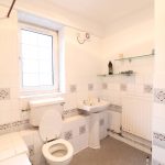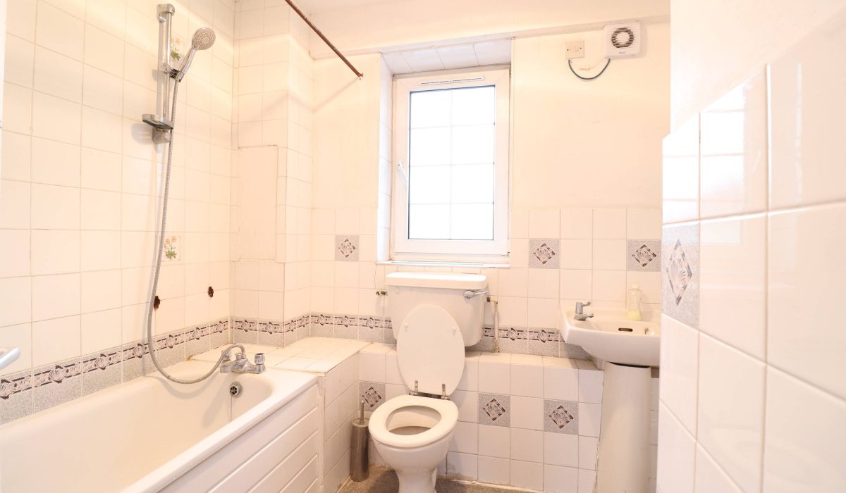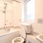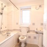 Three-piece bath suite, lino flooring, tiled walls, bath with shower attachments, washbasin with a separate tap, toilet with a low-level flush.