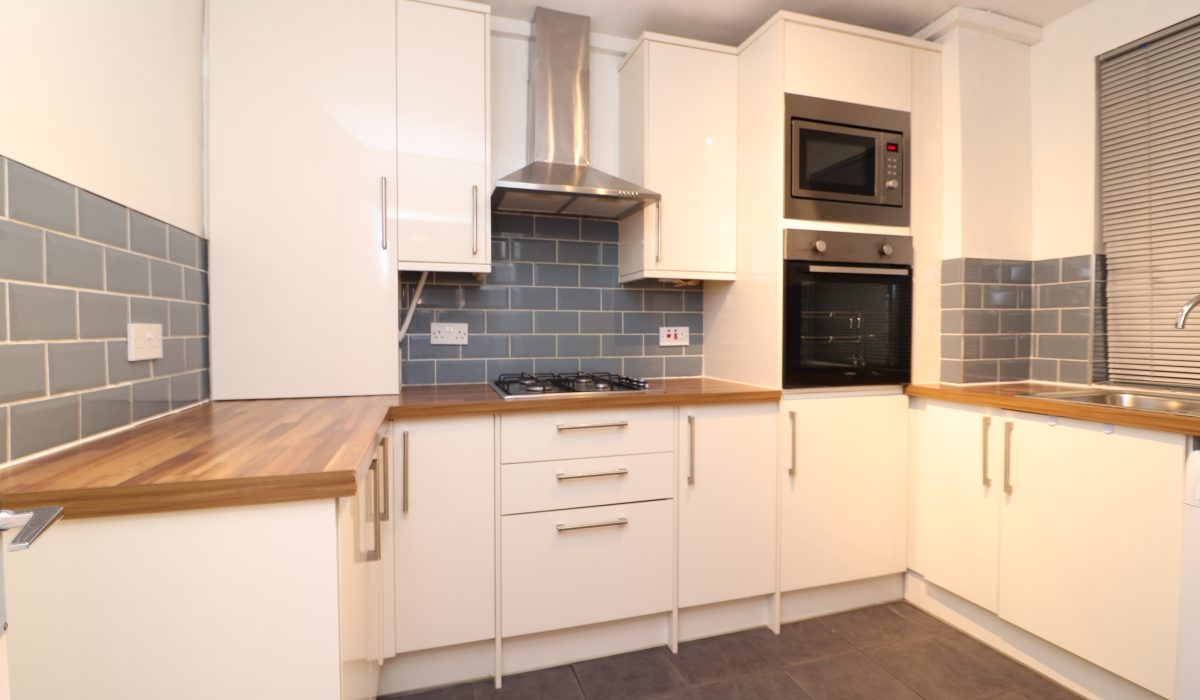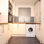 Tiled floor, part tiled walls, front aspect double glazed window, various eye level and base units, built-in four-hob gas cooker with extractor fan, stainless steel sink with mixer taps, free-standing washing machine. Integrated fridge/freezer, and washing machine, various power sockets and light fittings.