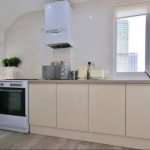 Wood laminate flooring, tiled walls, stainless steel sink with mixer taps, laminate worktop, range of base level units, double glazed windows and various power points.