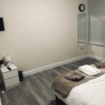 Wood laminate flooring, double wardrobe, double bed, bedside table and various power points.