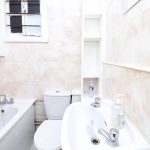 Tiled flooring throughout, 3 piece bath unit with shower attachment, low-level flush WC, wash hand basin with mixer tap, tiled walls, radiator, light fitting.