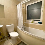 Tiled flooring throughout, fully tiled walls, bathtub with mixer taps and shower attachments, wash basin with mixer taps and low-level flush W/C.