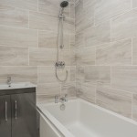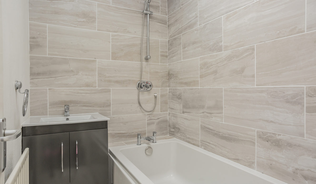 Single mixer tap sink with integrated storage. Bath with shower head, fully tiled floor, partially tiled walls to bath and sink area, single radiator, skylight, and extractor fan.