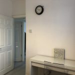 Double bed, wood laminate flooring. Two-door wardrobe, desk and chair. Various power sockets, radiator, small chest, double glazed window.