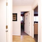 Wood laminate flooring, built-in cupboard.