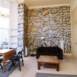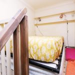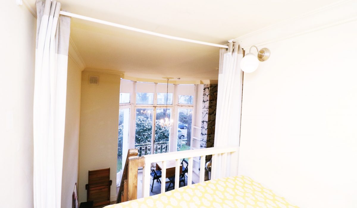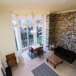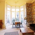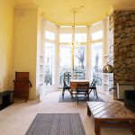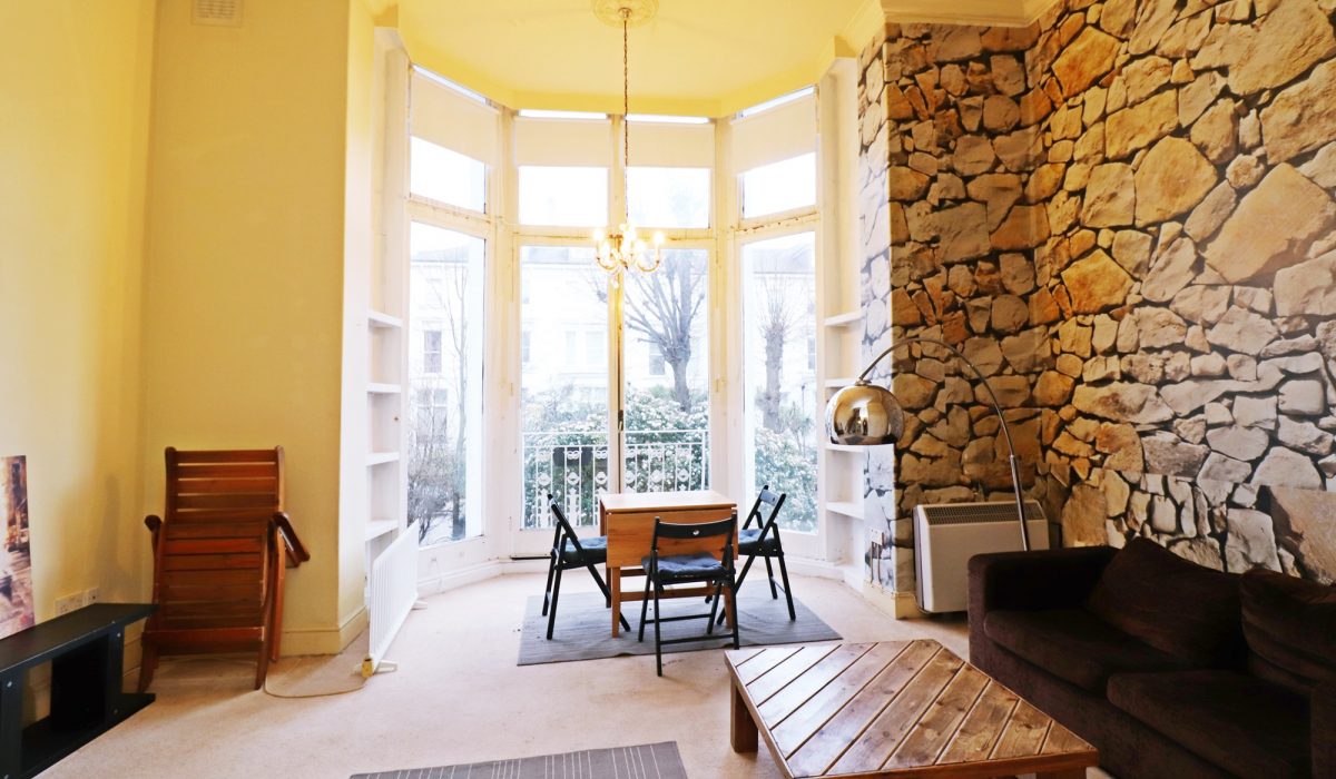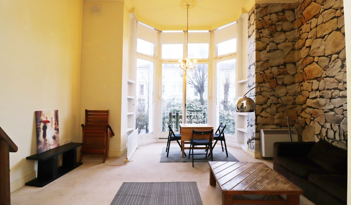 Carpeted flooring throughout, a two-seater sofa, dining table and chairs, bay windows, stairs leading to bed area and various power sockets.