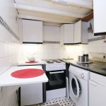 Tiled flooring, eye and base level storage units, standing gas hob and oven, fridge/freezer, washing machine and tiled walls and various power sockets.