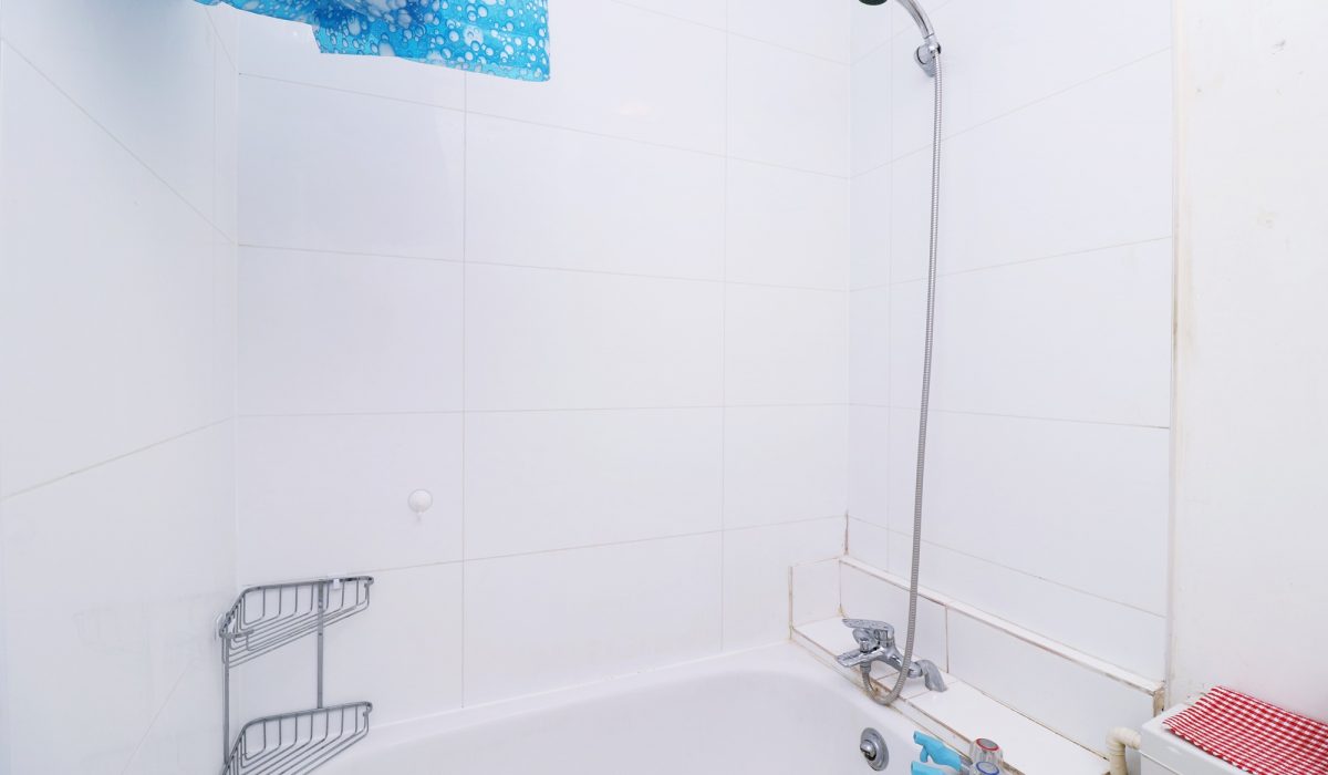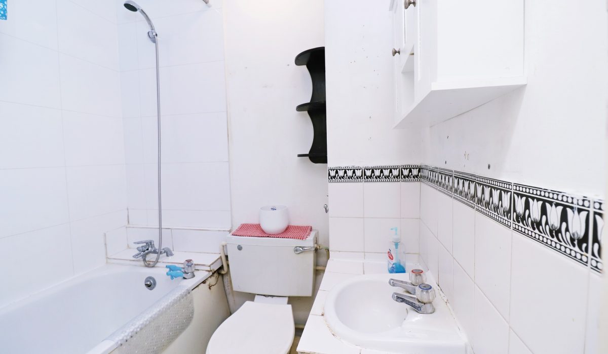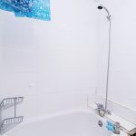 Part tiled walls throughout, shower with shower attachments, washbasin with separate hot and cold taps and toilet with a low-level flush.