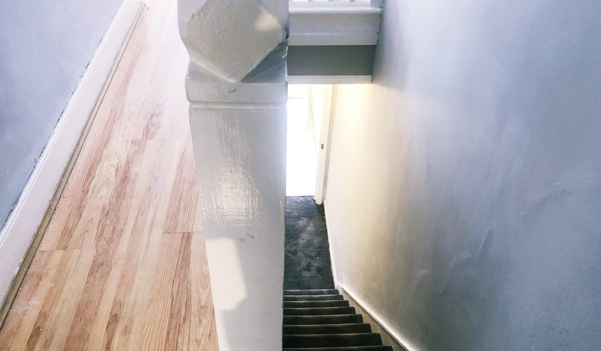 Shared entrance / Carpeted stairs leading up to flat.
