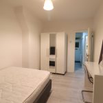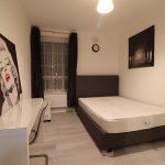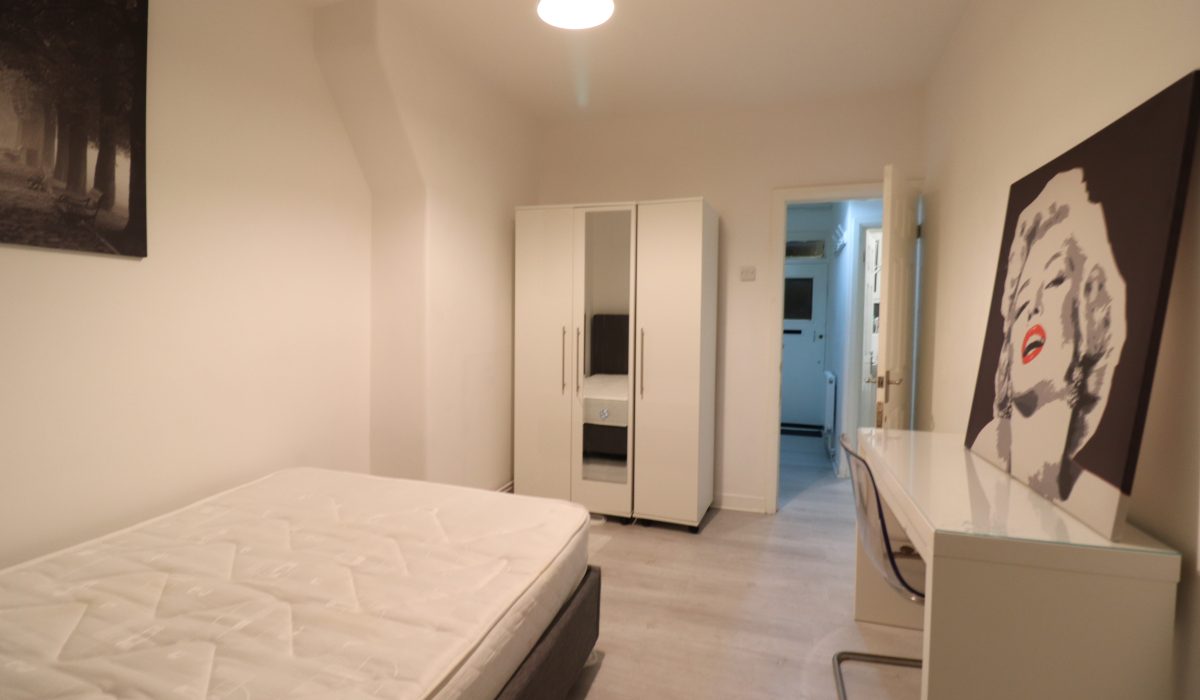 Double bed, wood laminate flooring. Three-door wardrobe, desk and chair. Various powers sockets, radiator, small chest of drawers, double glazed window.