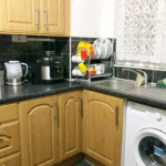 Range of base and eye level units, part tiled walls, stainless steel sink with mixer taps, double glazed window, power points, light fittings and free-standing washing machine.