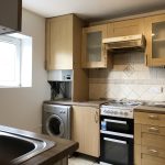 Fully tiled kitchen, range of eye and base level units, integrated electric cooker, stainless steel sink with mixer taps and double glazed windows.