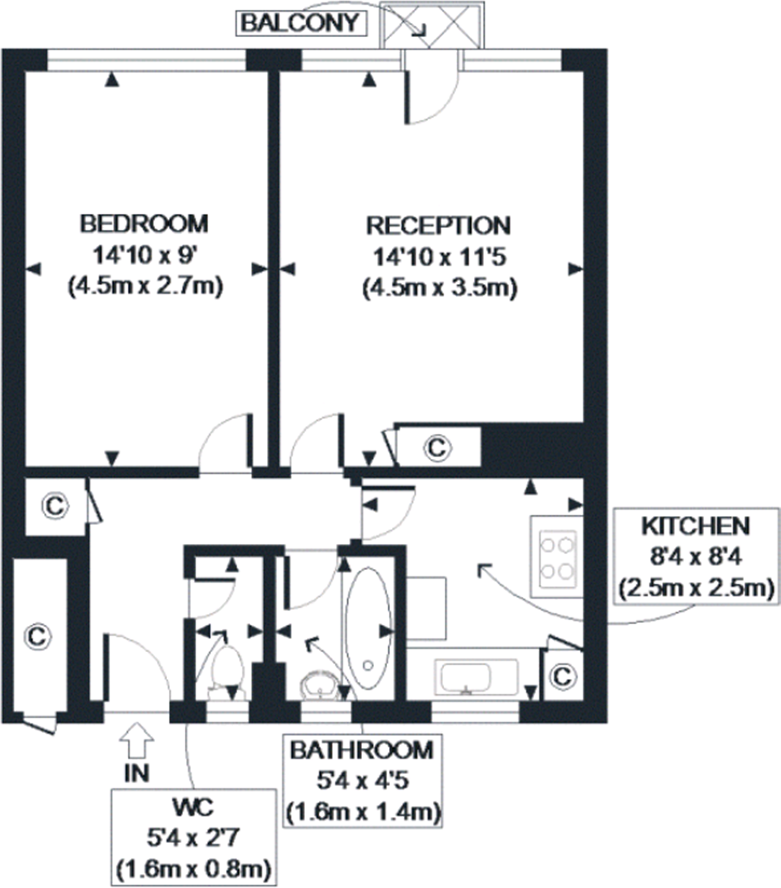 Bedroom: 14’10 x 9’0 (4.5m x 2.7m)