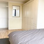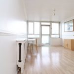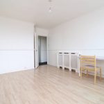 Wood laminate flooring, single radiator, intercom system, dado rail, thermostat, light fitting and storage cupboard.