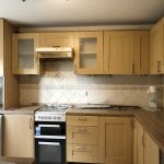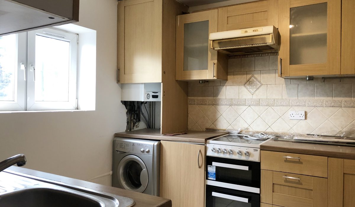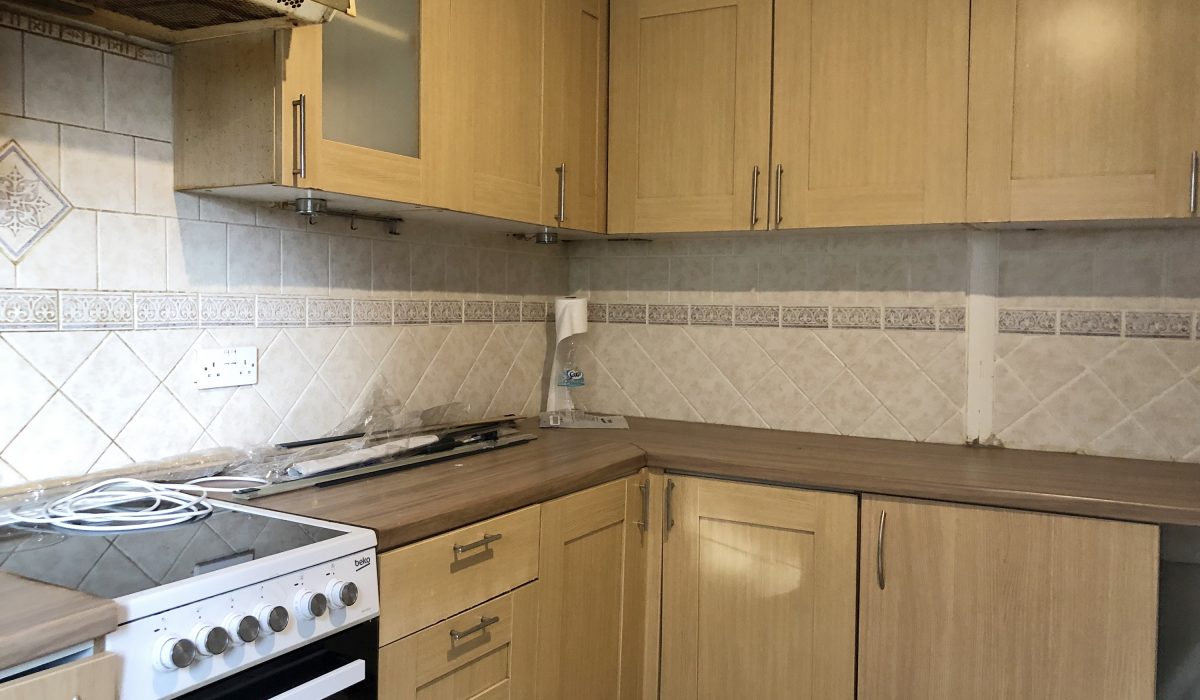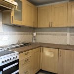 Fully tiled kitchen, range of eye and base level units, integrated electric cooker, stainless steel sink with mixer taps and double glazed windows.