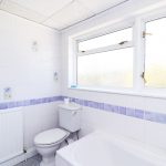 Bath with separate taps, shower unit with shower attachment, sink with separate hot and cold taps, toilet with low level flush, lino flooring, tiled walls , rear aspect double glazed windows.