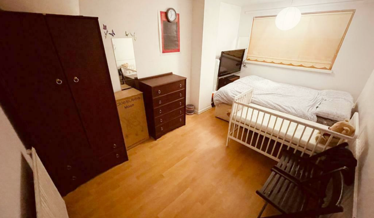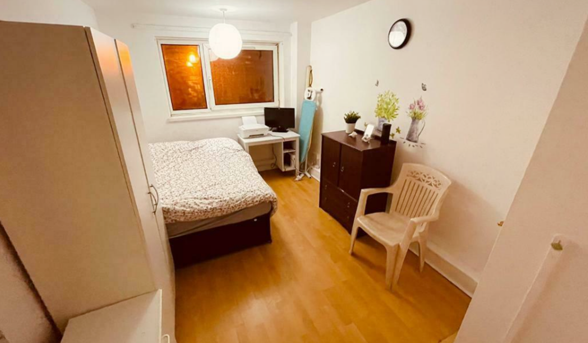 Laminate flooring, double glazed window, TV and stand, 2-door wardrobe chest of drawers, various power sockets, double radiator.