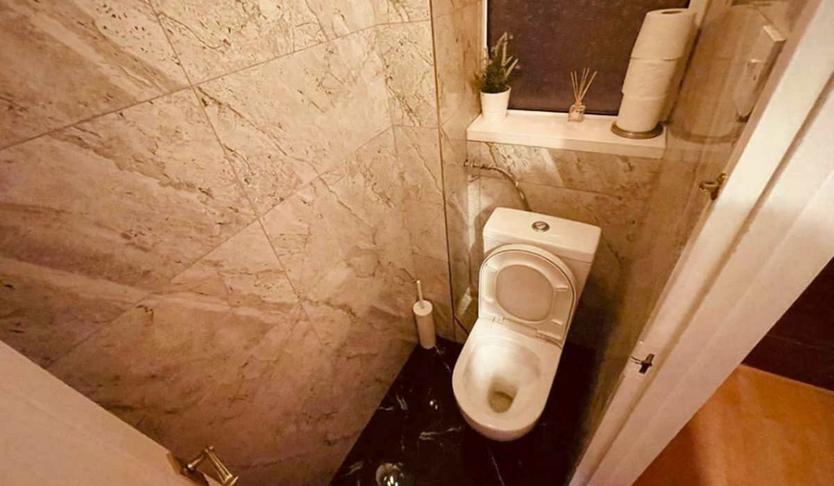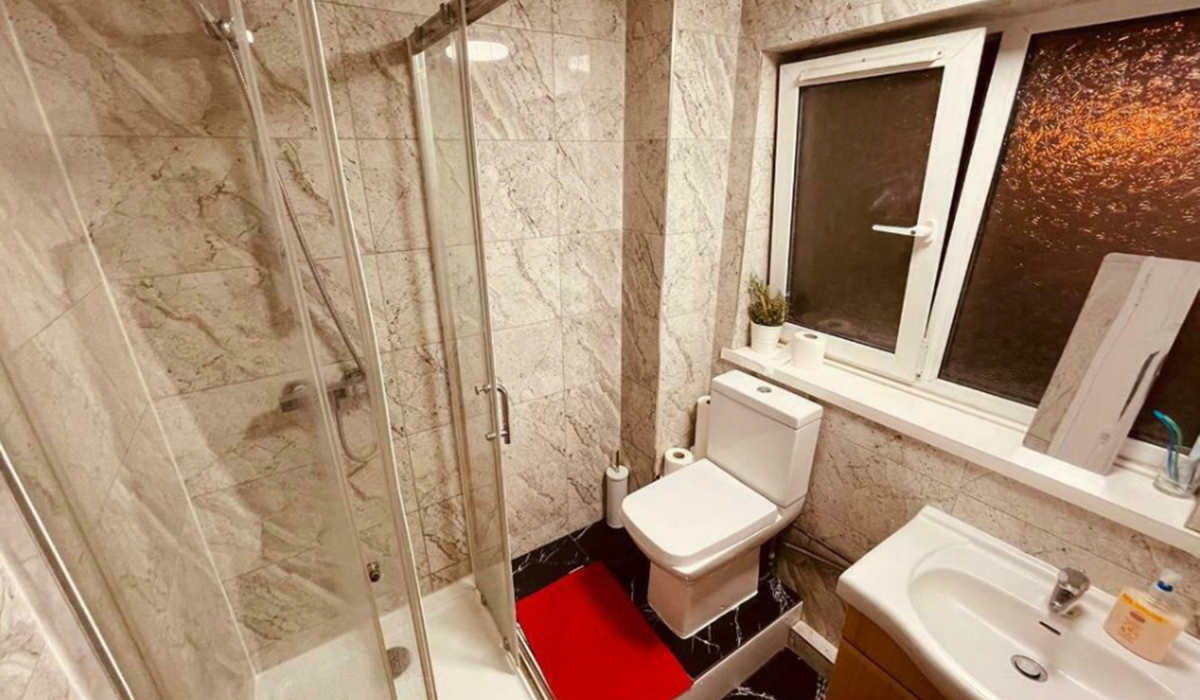 Three-piece fully tiled shower suite. Low-level flush WC, washbasin with mixer tap, shower stall, double glazed windows.