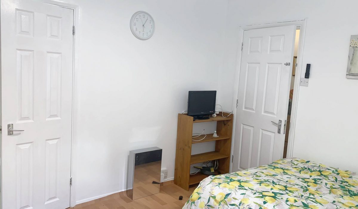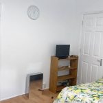 Laminate flooring with a double storage bed, wardrobe, chest of drawers. Folding table and share with a small TV set