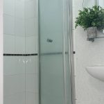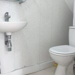Tiled flooring, shower, wash hand basin with mixer taps, toilet with low-level flush.