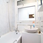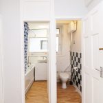 Two Piece Bath suite with shower attachment, wash basin with mixer tap, radiator.