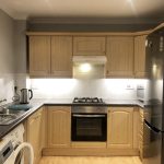Range of eye and base level units, integrated gas hob and oven, stainless steel sink, fridge/freezer, washing machine and laminate worktop.