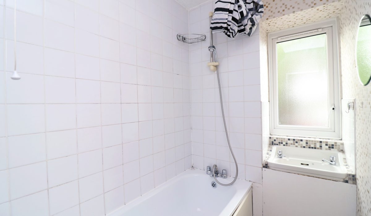 Two-piece bathroom, bathtub with mixer taps and shower attachments, washbasin, double glazed window and laminate flooring.