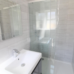 Three-piece shower-room, tiled walls and flooring throughout, shower cubicle with sliding doors and shower attachments, washbasin with mixer tap, toilet with low-level flush, towel radiator and laminate flooring.