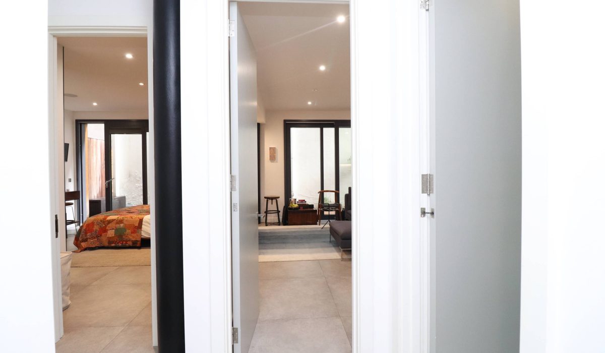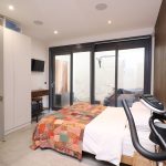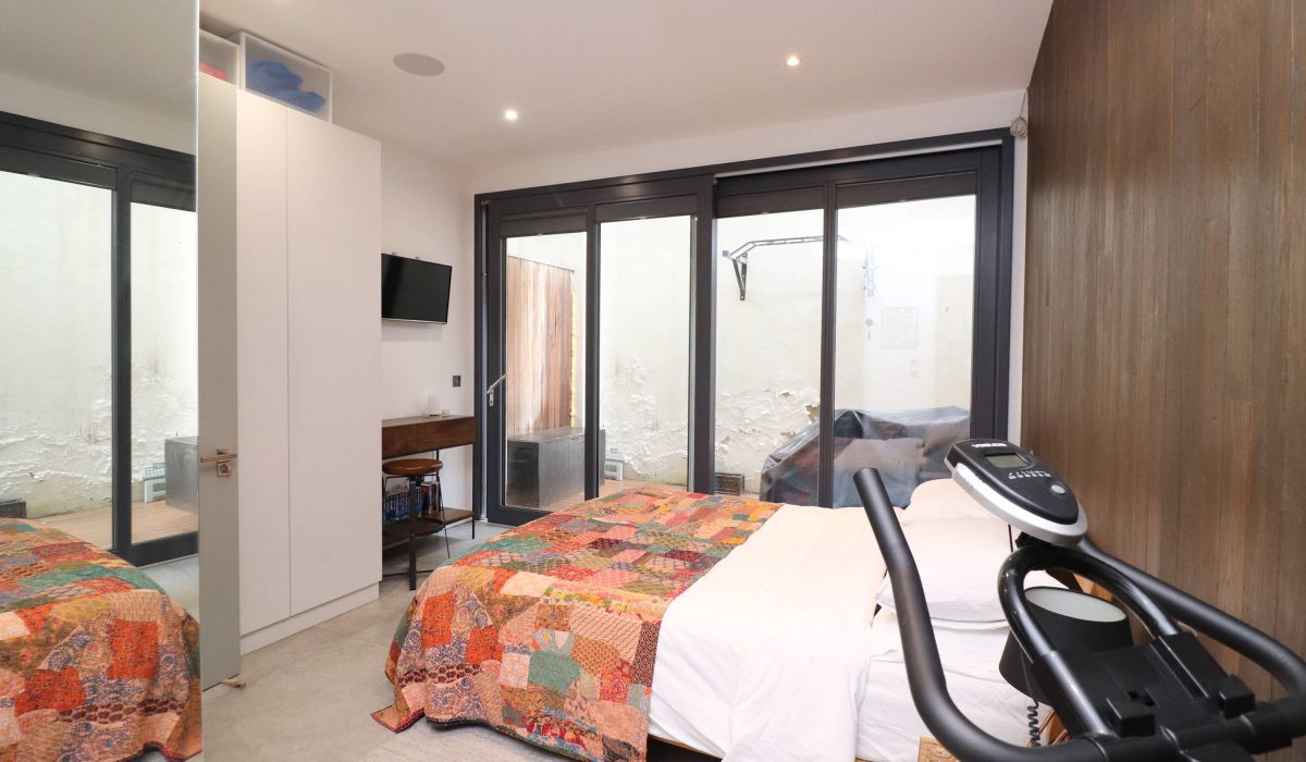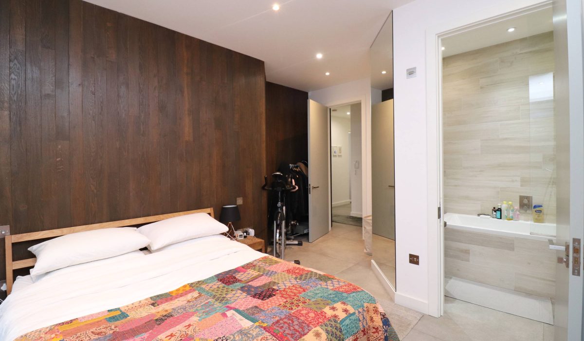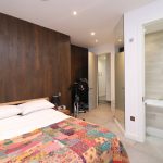 Tiled flooring throughout, underfloor heating, spotlights, king-sized bed, built-in ceiling speakers, television, chest of drawers and various power points.