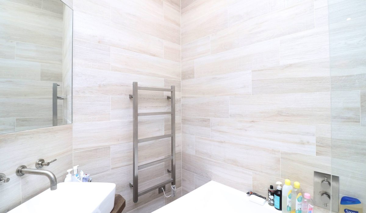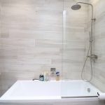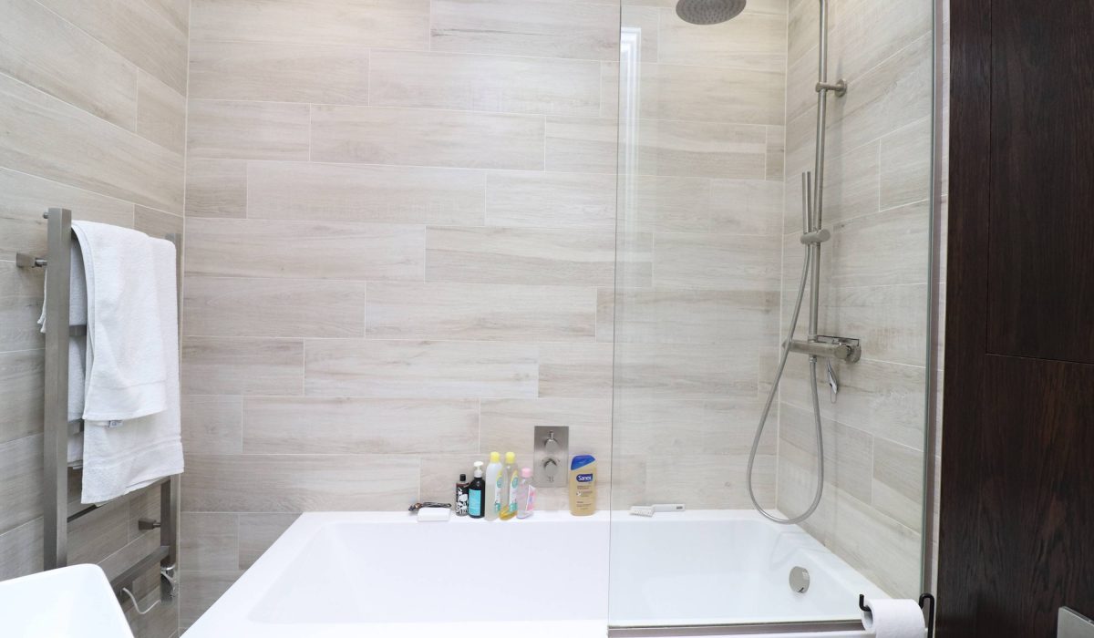 Three-piece bathroom suite, tiled walls and flooring throughout, bathtub with shower screen and shower attachments, towel radiator and washbasin.