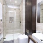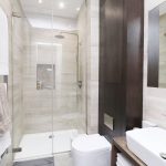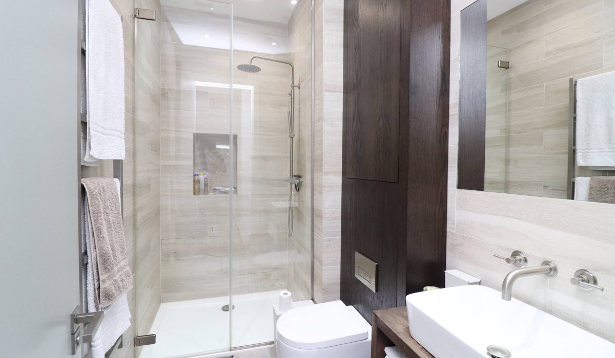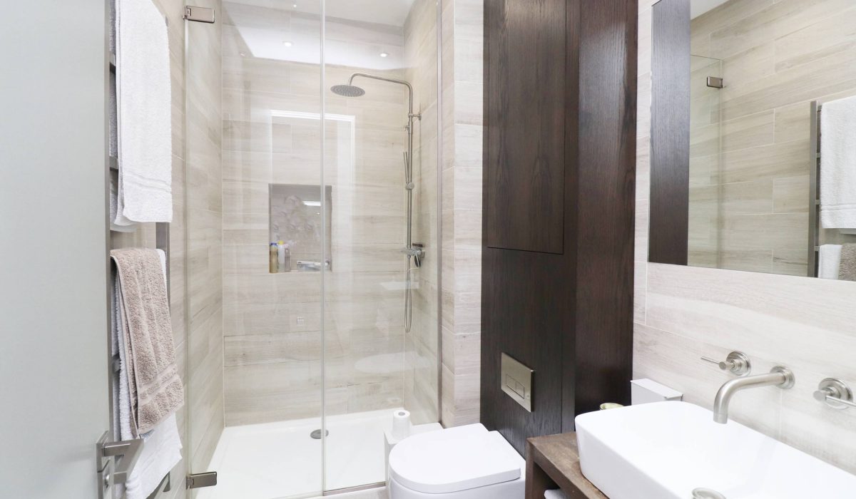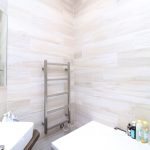 Three Piece shower suite with shower attachments, tiled flooring with underfloor heating, low-level WC, washbasin with mixer tap and towel radiator.
