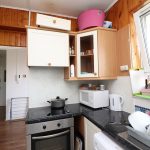 Front facing kitchen. Various large low level cabinets. Stainless steel sink with drainer. Tiled flooring. Electric hob and built in oven. Washing machine, microwave and fridge freezer.
