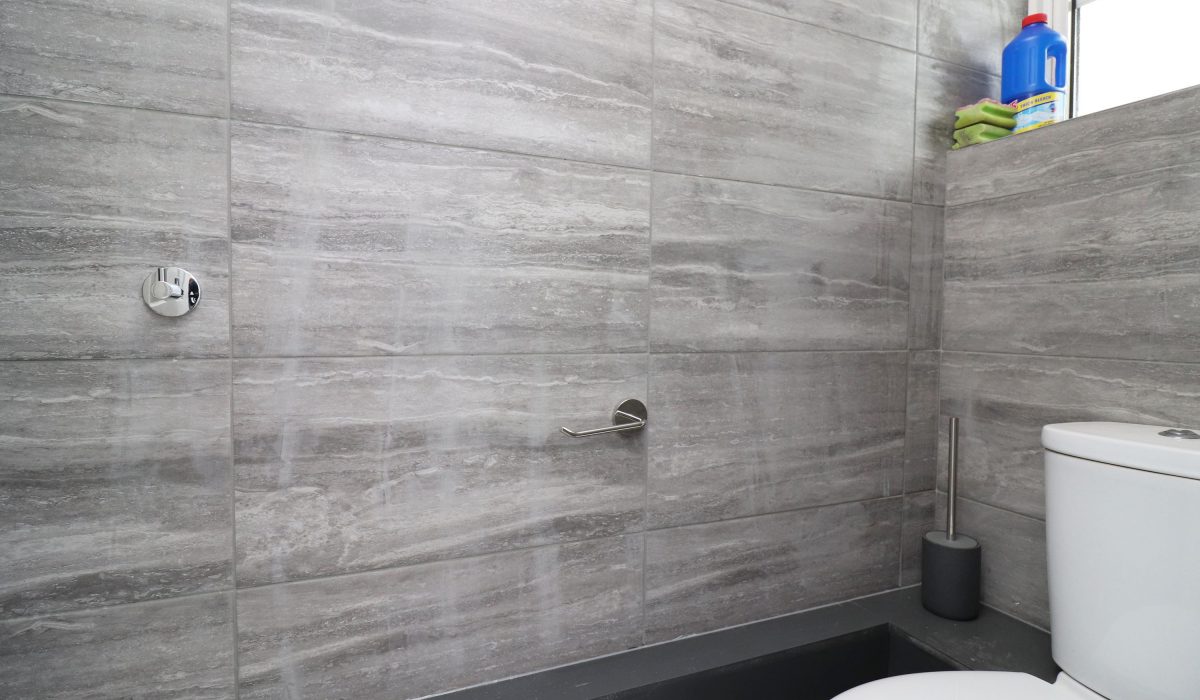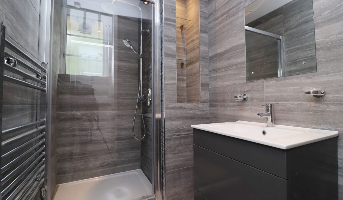 Two-piece shower room, fully tiled walls and flooring, shower cubicle with mixer tap and shower head attachment, shower glass and washbasin with mixer tap.