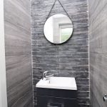 Fully tiled walls and flooring, toilet with low-level flush and washbasin with mixer tap.
