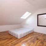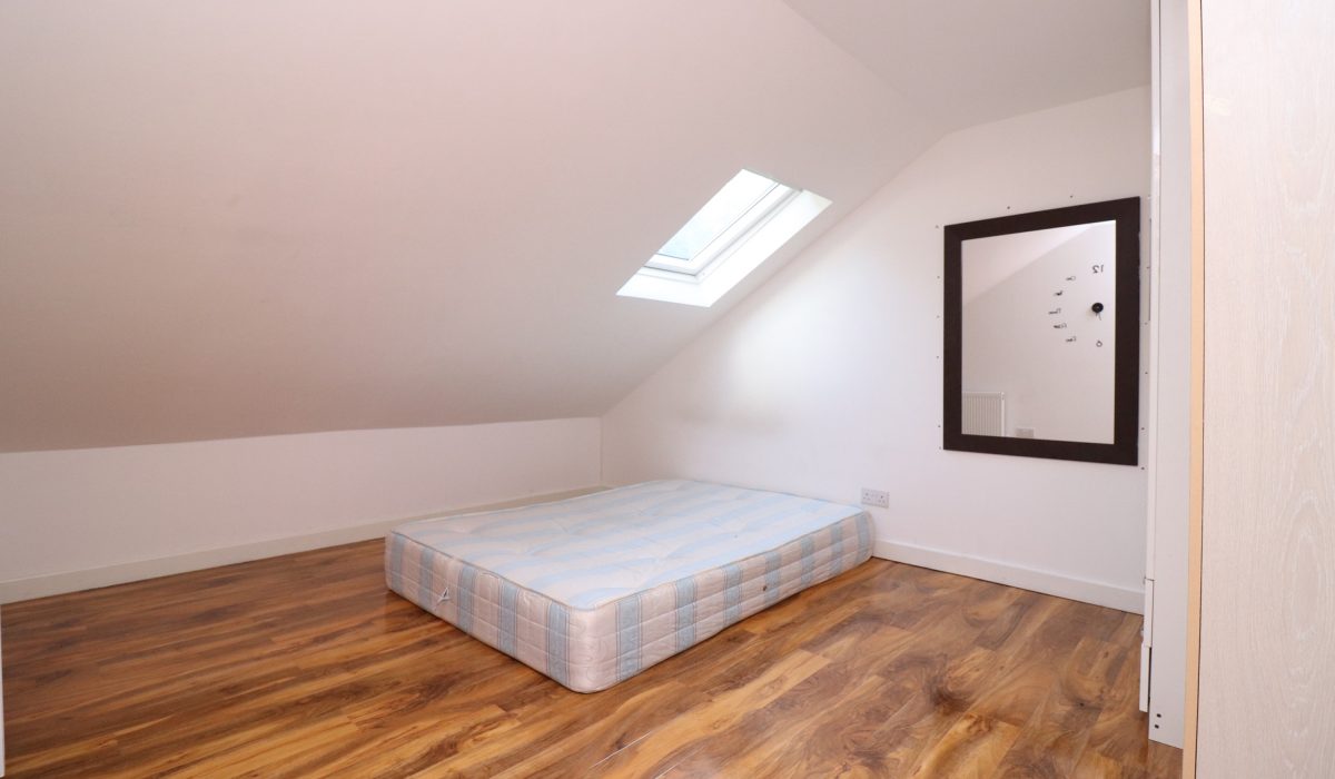 Laminate flooring, double bed, chest of drawers, desk, double glazed windows, single radiator and various power points