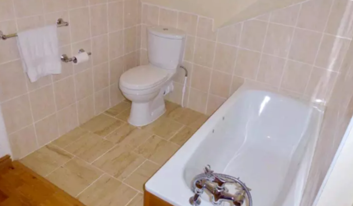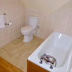 Two-piece bath suite, low-level flush WC, bathtub with mixer tap and shower attachment.