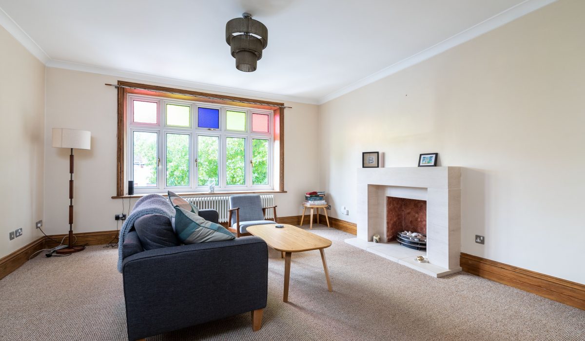Carpeted flooring, feature fireplace with marble surround, double radiator, double glazed windows to front and side aspects, various power points and light fittings.
