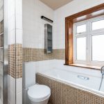 Four piece bathroom suite, fully tiled, bathtub with shower attachment, low level flush WC, wall hanging hand wash basin with designer mixer taps, walk-in shower cubicle with power shower, heated towel rail, storage units and front aspect obscure double glazed window.