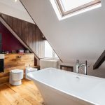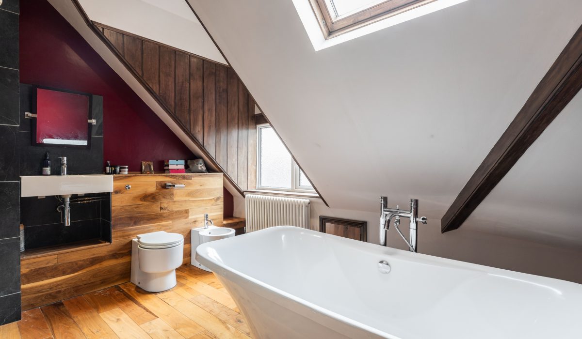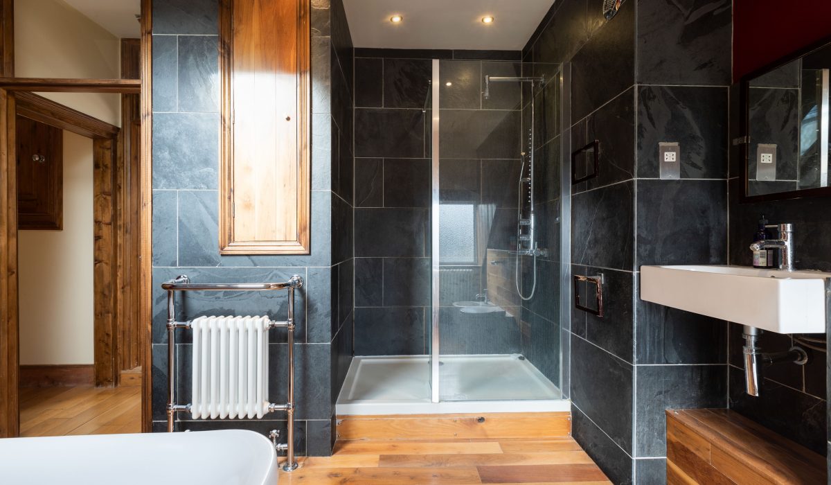 Wooden flooring, tiled walls, four piece bathroom suite, roll top bath on claw feet, low level flush WC, wall hanging hand wash basin with mixer taps, walk-in shower cubicle with power shower, heated towel rail, storage units and front aspect obscure double glazed windows.