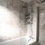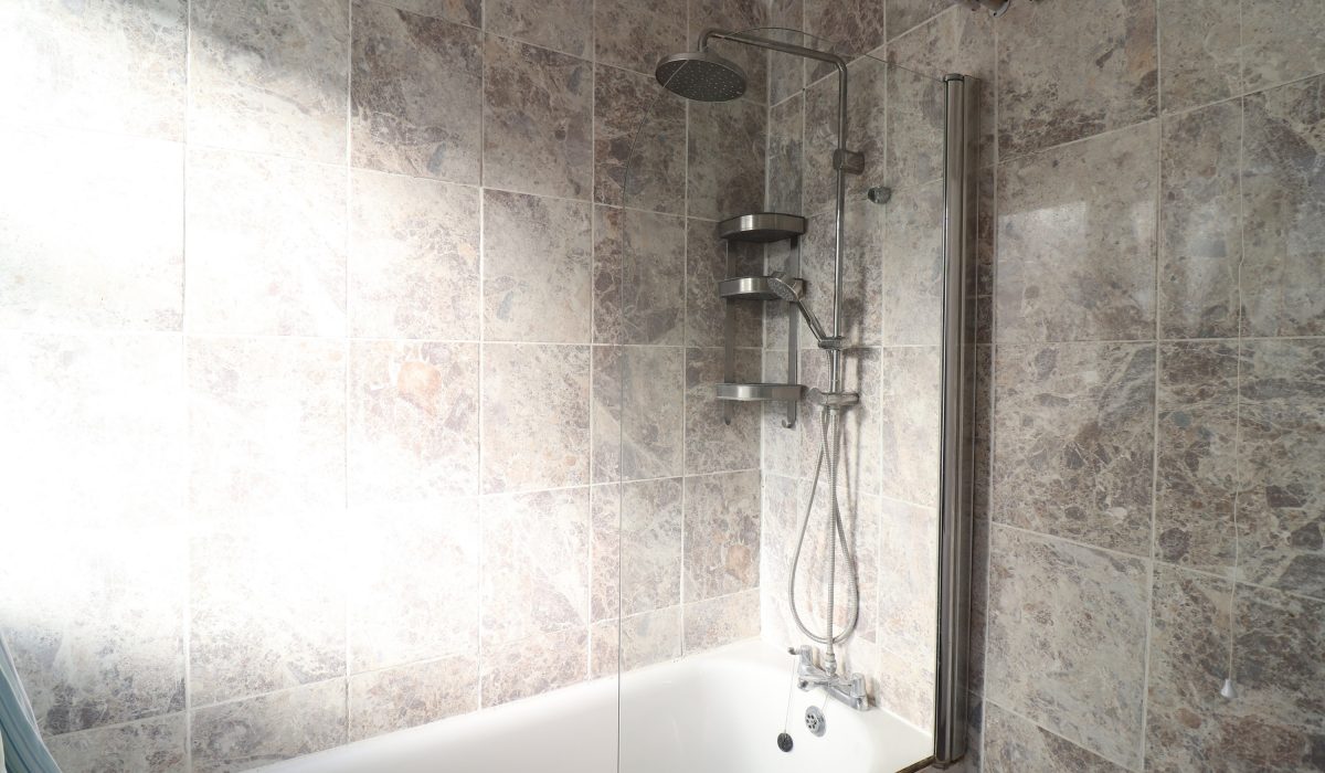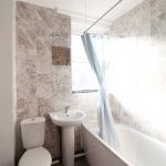 Three-piece shower room, tiled flooring, part-tiled walls, low level flush WC, washbasin with mixer taps