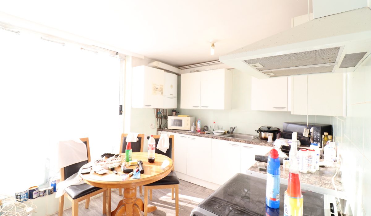 Tiled flooring, four hob gas cooker, stainless steel sink with mixer taps, dining table and chairs, access to the garden.