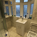 Three-piece bathroom, fully tiled, bath with shower attachment and shower glass, low-level flush WC, washbasin with mixer tap, towel rack.